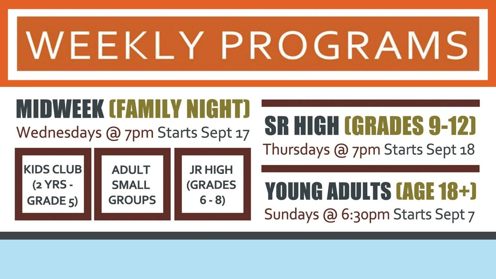 Wednesdays @ 7PM Childcare is available in the kids wing for children (aged 2-grade 5) during the adult mid-week Bible studies at the church. Jr High programming is also available for grades 6-8 in the sports lounge during this time.